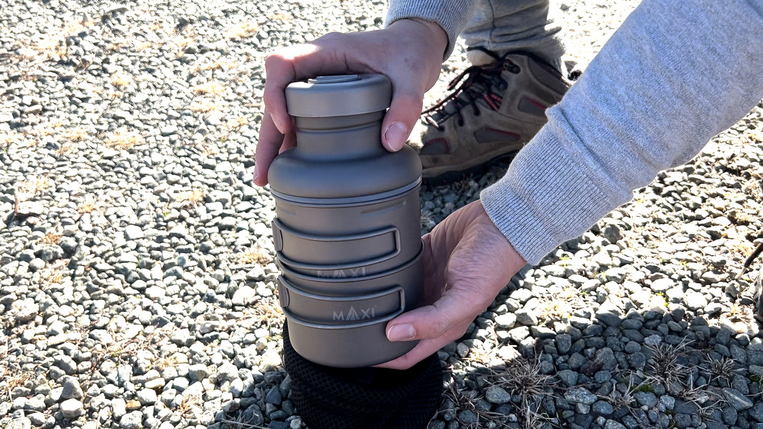 This water bottle can be converted into a pot by opening the body. The sealing mechanism is straightforward: it includes a silicone gasket attached to the neck portion. When the neck is screwed onto the body, the water bottle forms an airtight seal.